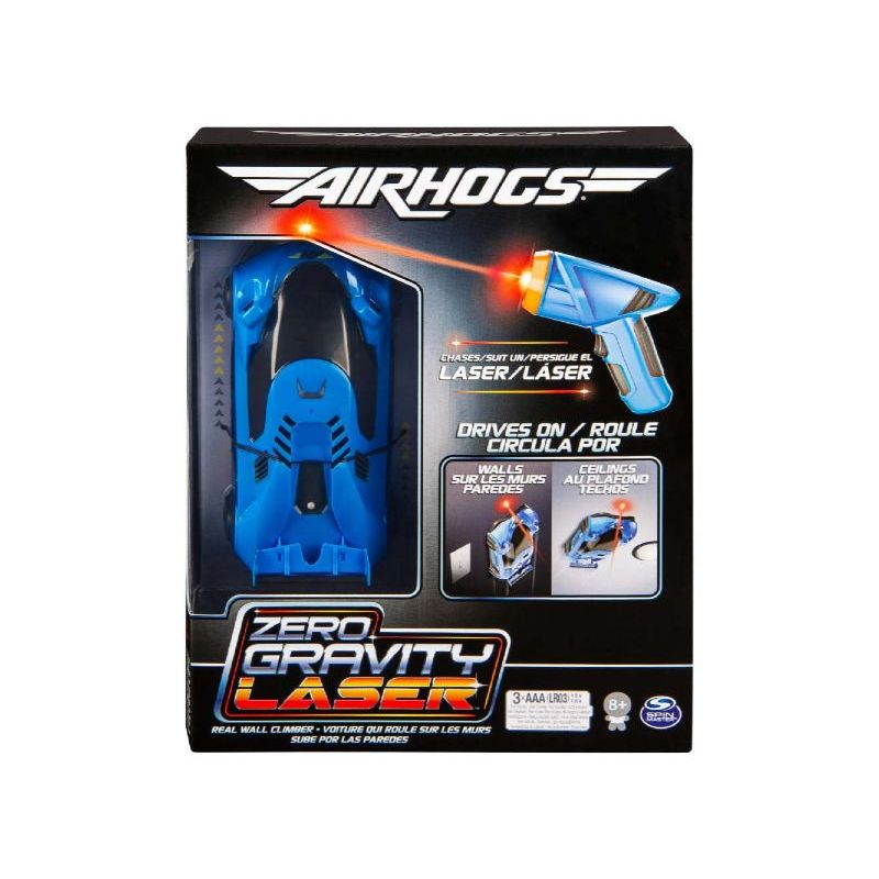 Пркосете и на гравитацијата со Air Hogs Zero Gravity Laser. Користејќи ја патентираната технологија Wall Climber, ова лесно возило вози по подови, по sидови, па дури и на таван! Насочете ја ЛЕД-светлината на контролорот на која било мазна површина во радиус од 1 метар од возилото и ќе почне да се движи возилото! Нулта гравитациониот ласер користи USB батерија на полнење.