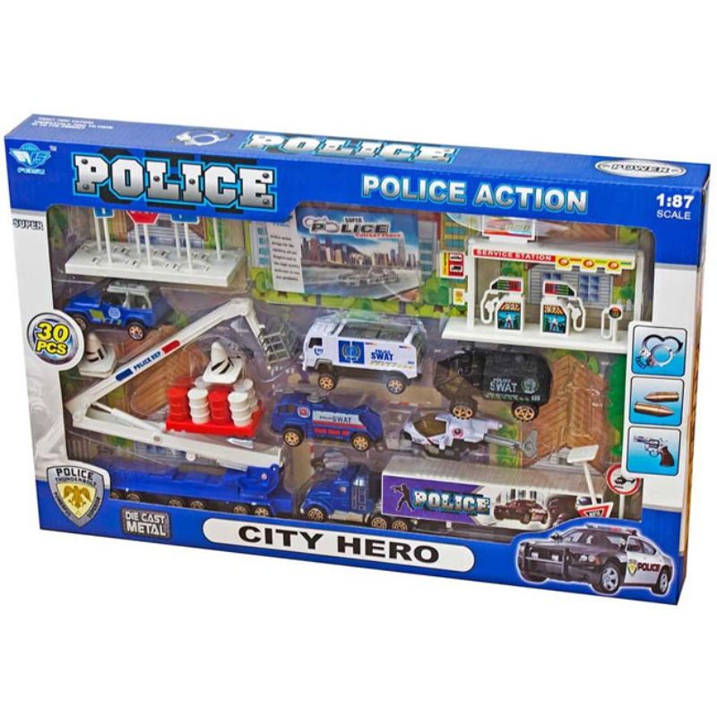 Полициски сет кој содржи 30 елементи, вклучувајќи специјални полициски возила, два камиони и полициски хеликоптер.