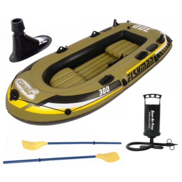 Чамец Fishman 350, димензии 305x136x42 cm. За 3 + 1 лица со вкупна тежина до 340 kg. Вградени држачи за весла (странично и горно), држач за стап за риболов, ПВЦ оддел за држење работи, јаже за околу целиот брод. Сетот содржи рачна пумпа, пар весла (метални рачки), 2 перници за седење.