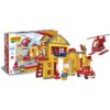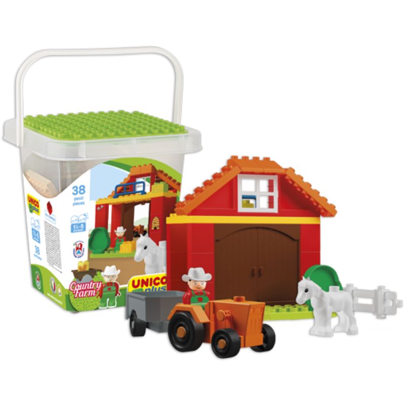 Кофичка со основа капак полна со коцки во боја за градење мала фарма. Вклучува 1 лик, трактор со приколка, коњ, додатоци и налепници.