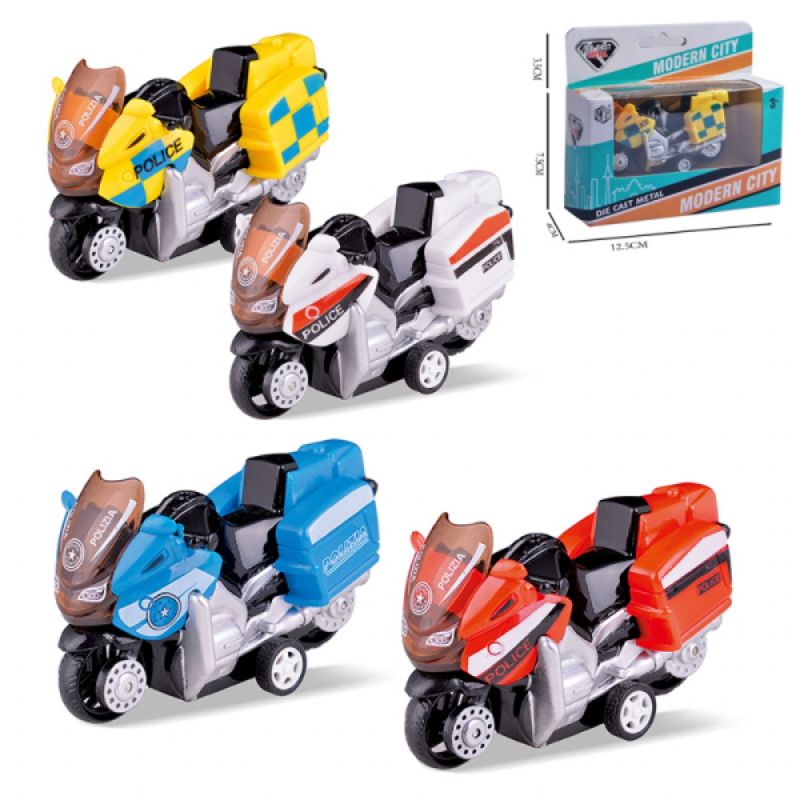 Мал полициски мотоцикл од легура на метал и пластика. Работи на систем „pull back“. Во жолта, бела, сина или црвена боја, кои се продаваат одделно.