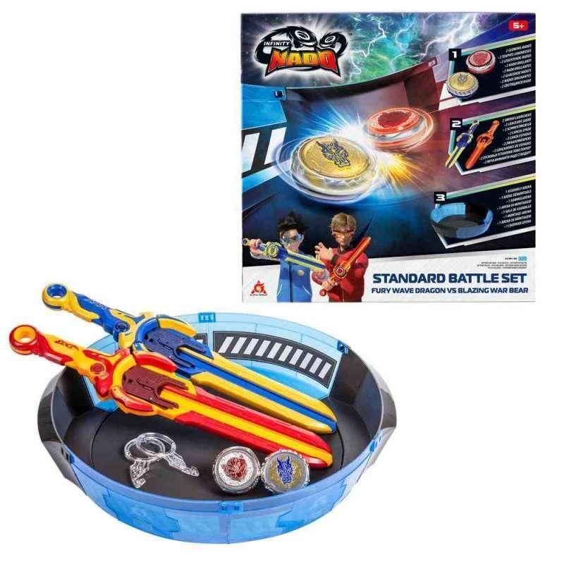 Ви го претставуваме сетот infiniti Nado Series VI Battle кој вашите малечки ќе го обожаваат. Сетот вклучува: Две метални Nado шипки со LED светла. Двајца фрлачи на мечеви. Битката арена.