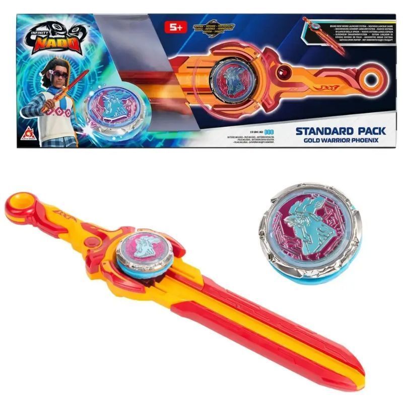 Стандарден пакет Infiniti Nado – Gold Warrior Phoenix Најновата серија на Hurricane Fighting Soul! Секогаш непобедливиот борбен врв овој пат е лансиран со нов режим на игра! За разлика од претходните фрлачи, овој фрлач се појавува во форма на меч. Инсталирајте го горниот дел во отворот за лансирање, притиснете го капакот за да ја складирате енергијата, извлечете го капакот откако ќе се складира полнењето и притиснете го копчето, горниот дел ќе се стартува. Сите врвови имаат ефект на сјај и светлата ќе ја менуваат бојата кога ќе се вртат. Овој пат лансирани се 5 стилови, а секој сет вклучува фрлач во облик на меч и ротирачки врв.