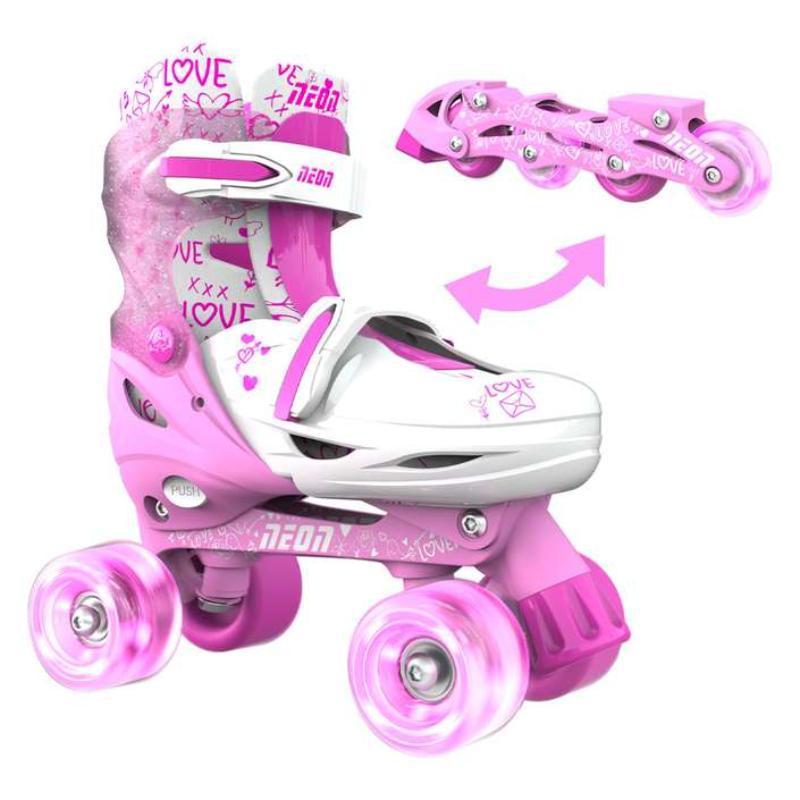 Комбинираните лизгалки NEON 2N1 го носат најдоброто од двата модели. Режимот Quad носи поголема стабилност за оние кои треба да стекнат доверба, додека режимот Inline може да се постави за оние кои сакаат да одат побрзо. Чизмите имаат прилагодлива големина за растење на стапалата. Тркалата на двете, Inline и Quads, имаат специјална технологија за сјај што ги прави да светат кога се движите.