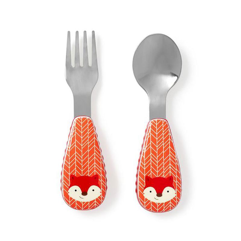 Вилушка и лажица од не’рѓосувачки челик. Рачката на овој прибор за јадење е изработена од безопасна пластика. Страничните рабови на рачката се изработени од мек материјал со засеци. Приборот за јадење толку лесно се држи со рацете на децата, дури и најмалите деца можат да го држат.