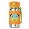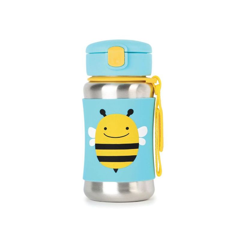Детски термос за пијалок од нерѓосувачки челик со силиконски ракав кој не се лизга за да ги заштити малите раце од студени површини. Има прилагодлив ремен што се прицврстува иможе да се прикачи, заедно со капак што се отвара, така што флексибилната сламка останува чиста.