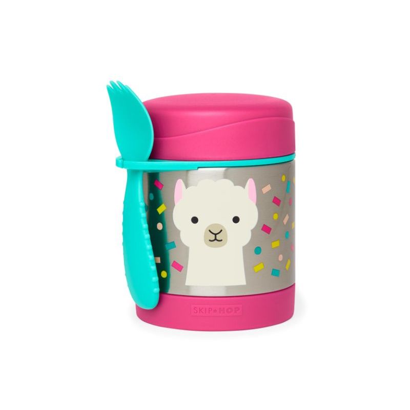 Детски термос за храна од нерѓосувачки челик кој ја одржува храна за деца топла или ладна. Термосот ја одржува храната топла 7 часа или ладна 5 часа. Вградениот држач одговара на повеќето додатоци. Вклучува вилушка што може да се користи и како лажица поради формата.