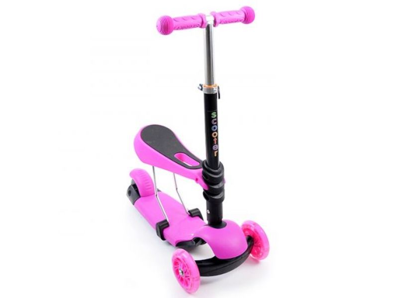 Тротинет 3 во 1 со седиште и рачка за водење. Тротинетот има три тркала, што ја зголемува стабилноста и безбедноста при возење. Погоден за развој на моторни вештини и координација преку забава на децата.